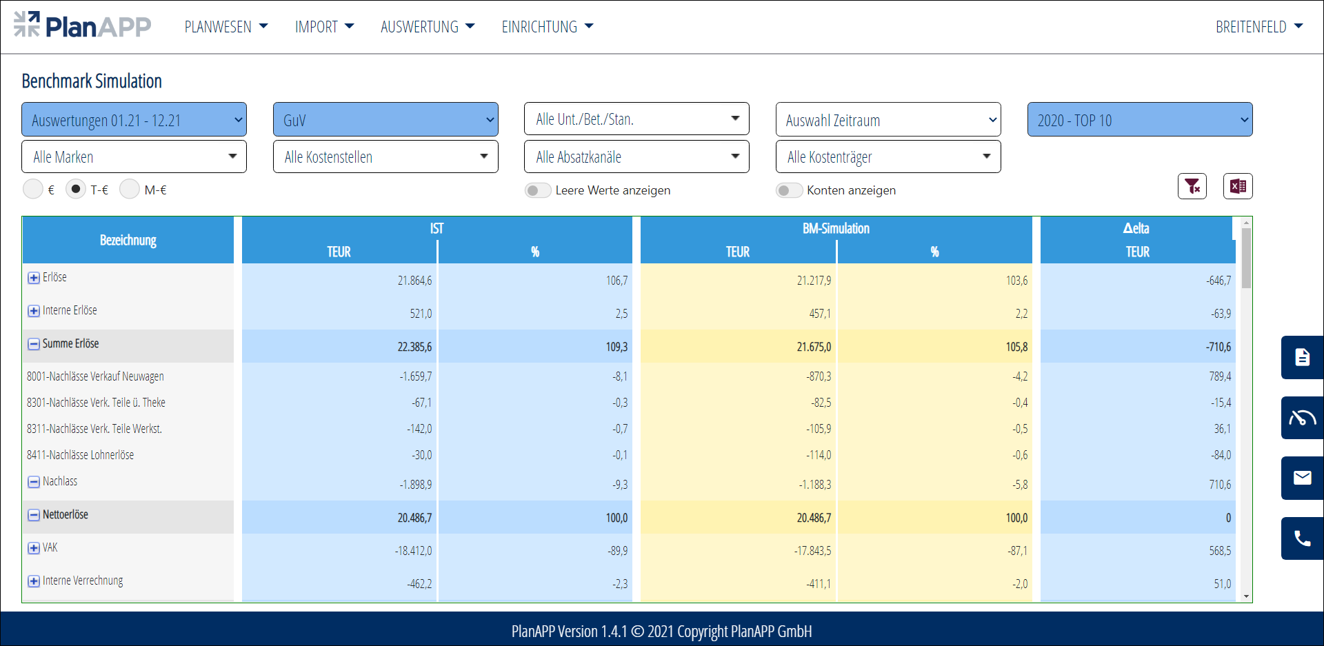 Mit Hilfe der Benchmark-Analyse steht Ihnen eine wertvolle und praxisnahe Informationsquelle zur Verfügung. Wenn Sie bisher noch kein PlanAPP-Kunde sind, können Sie das Benchmarking-Modul auch einzeln beziehen. Das Benchmarking wird quartalsweise aktualisiert und ist für Sie sofort einsetzbar. Neben des standardisierten steht Ihnen auch die Möglichkeit eines individuellen Benchmarkings offen. Durch PlanAPP haben Sie bei ungünstigen Entwicklungen die Möglichkeit, frühzeitig passende Maßnahmen zu ergreifen und effizient gegenzusteuern.
