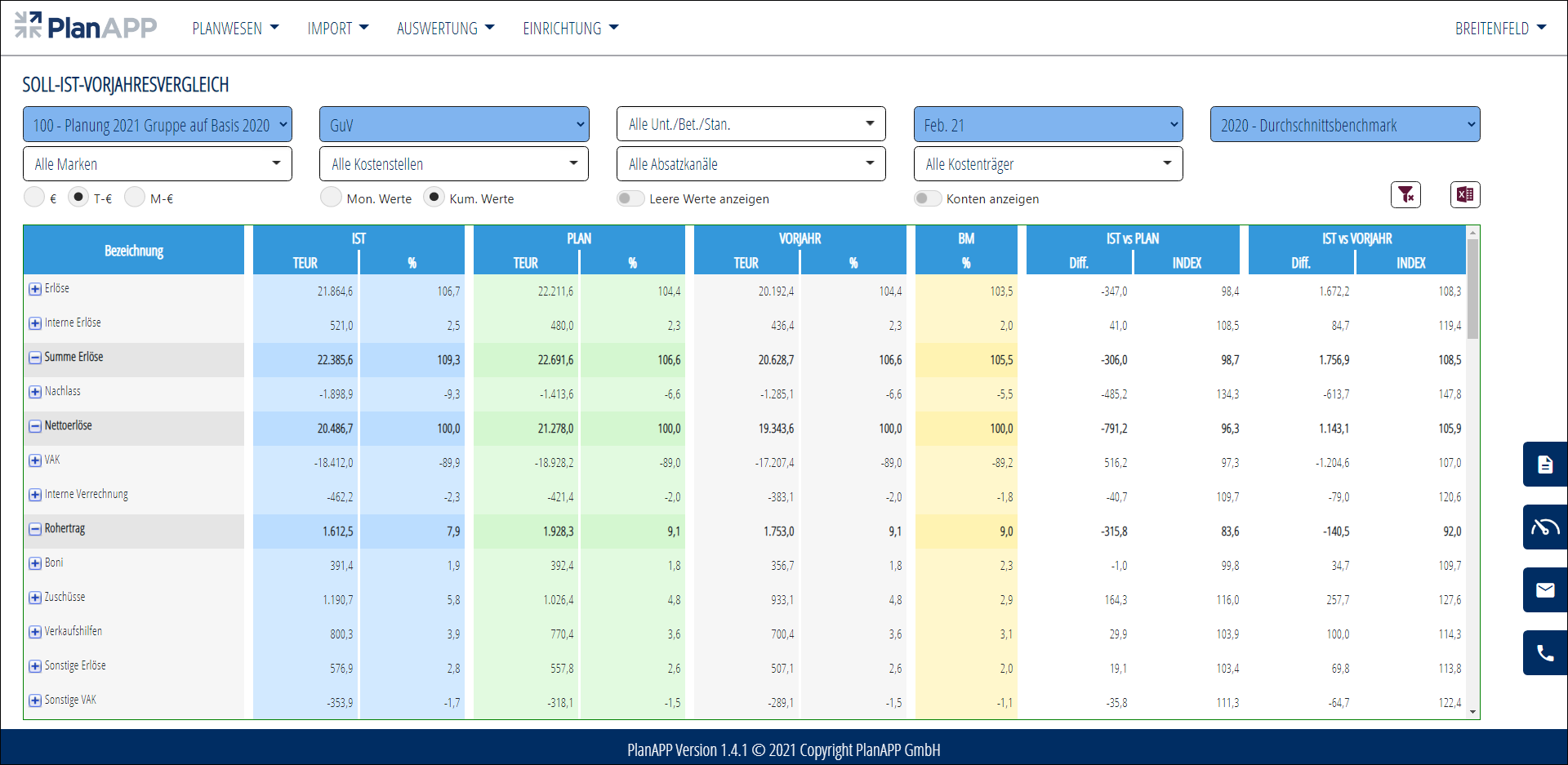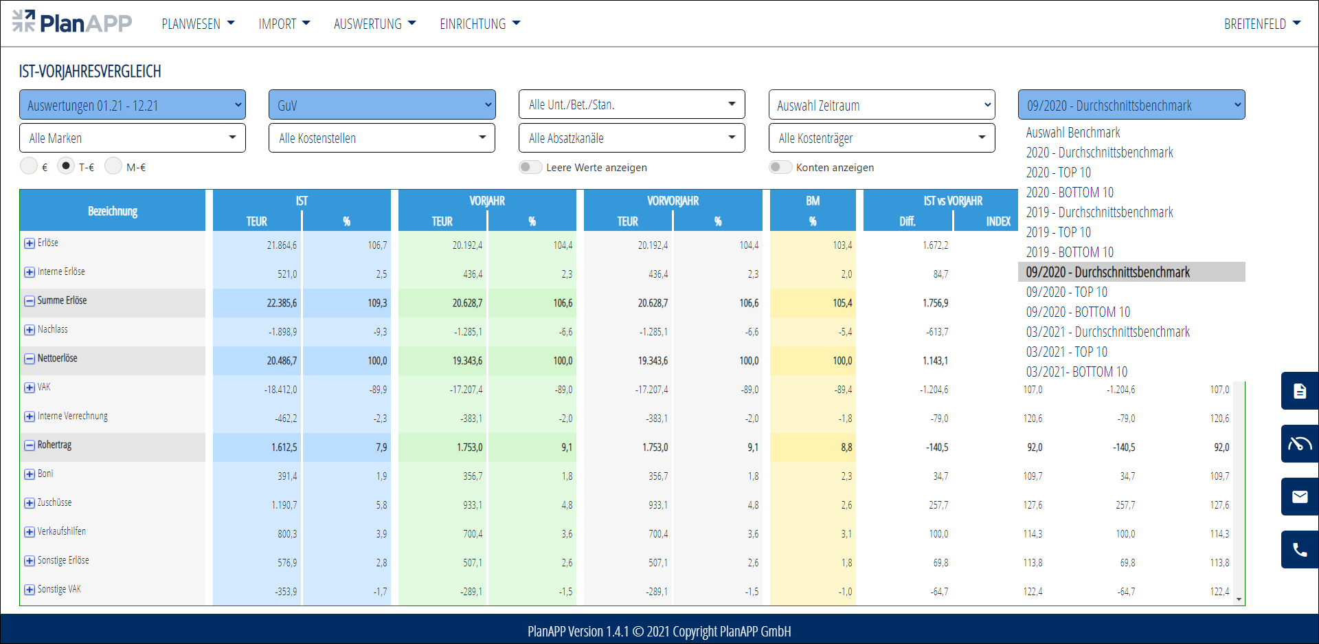 Der Soll-Ist-Vergleich bietet die Möglichkeit die aktuellen Jahresdaten mit der ausgewählten Planung zu vergleichen. Über die Benchmarkspalte erhält der Nutzer zusätzliche Informationen, wie sich die Relationen in der ausgewählten Benchmark-Gruppe im Vergleich zu den IST- und den PLAN-Werten entwickelt haben.