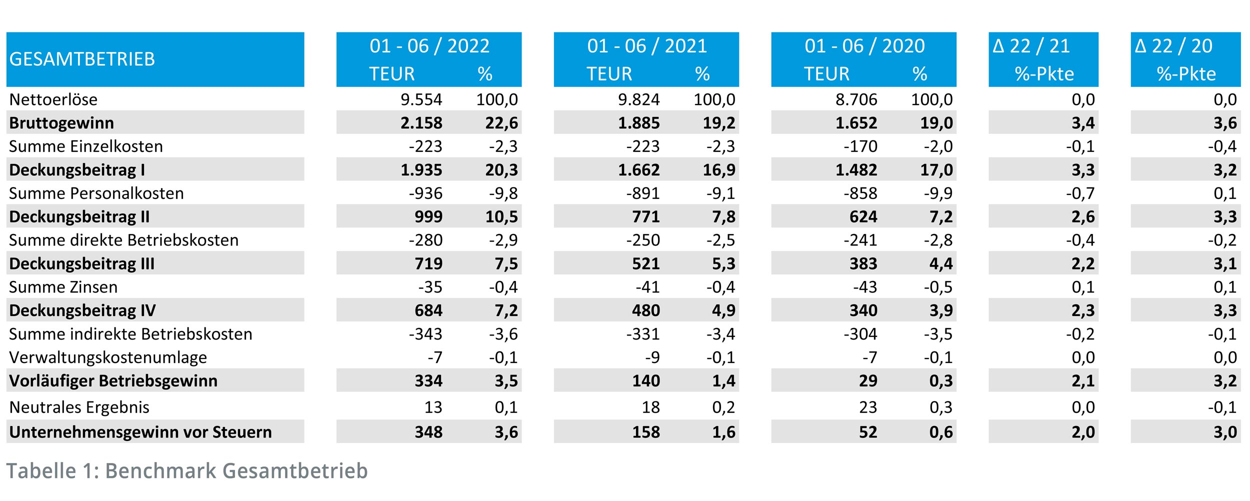 Der positive Trend hält an: Die aktuellen Benchmark-Werte für das Halbjahr 2022, die Nutzern der Controlling-Software PlanAPP zur Verfügung gestellt werden, belegen klar, dass die relativ guten Ergebnisse des ersten Quartals 2022 auch im zweiten Quartal 2022 fortgeführt werden konnten. Dabei konnte bei den Nettoerlösen und dem Bruttogewinn gegenüber den Vorjahren sowohl absolut als auch relativ eine teilweise deutliche Steigerung erzielt werden. Weiterhin fallen die Kosten in fast allen Bereichen gegenüber den Vorjahren absolut höher aus. Dennoch konnten die Deckungsbeiträge auf Gesamtbetriebsebene aufgrund der verbesserten absoluten und relativen Bruttogewinne teilweise deutlich gesteigert werden (Deckungsbeitrag III 2022: 7,5 Prozent; 2021: 5,3 Prozent; 2020: 4,4 Prozent).