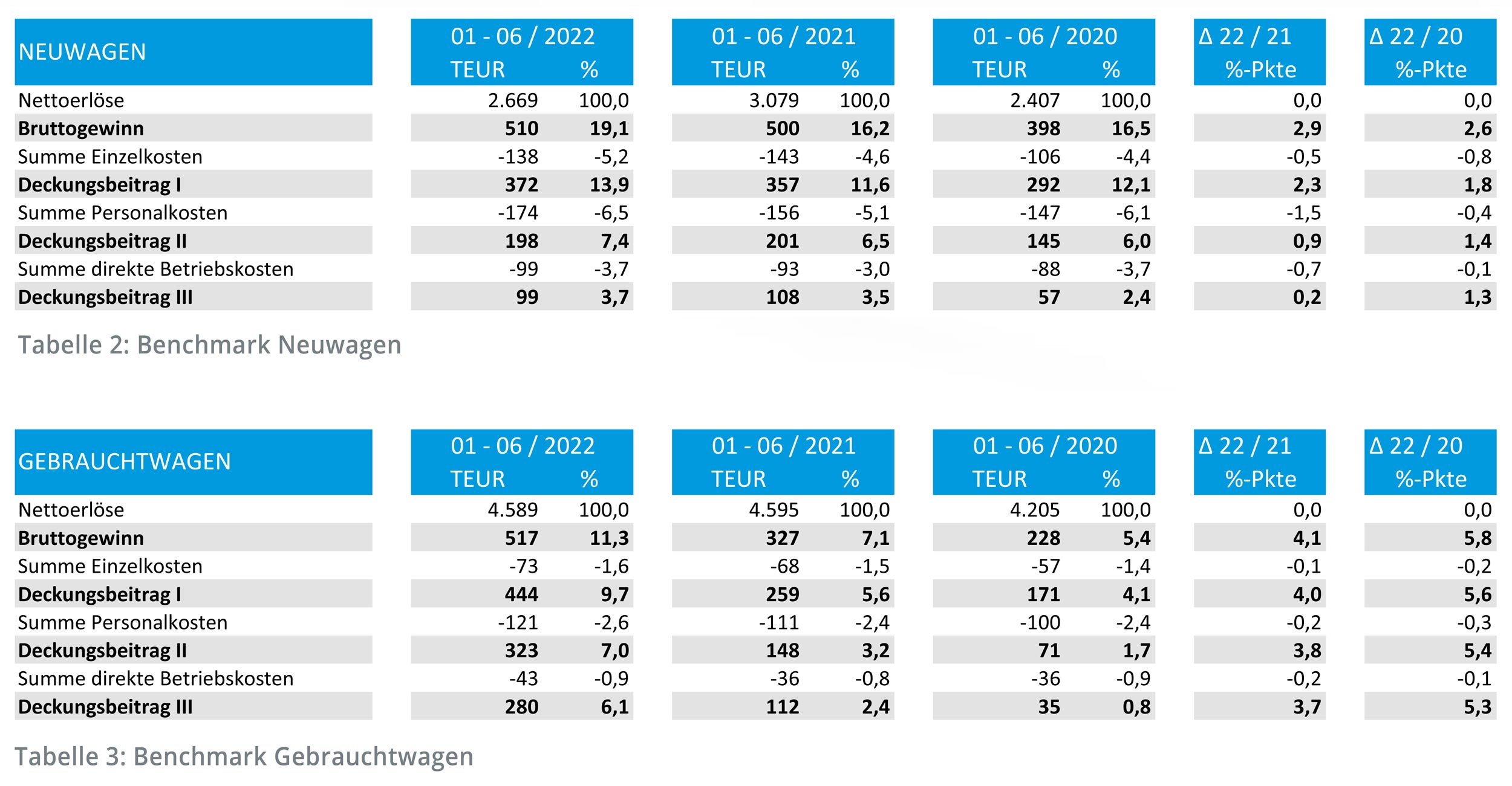 In einer vertiefenden Analyse zeigen sich die deutlichen Auswirkungen der aktuell weiterhin angespannten Liefersituation. Auch im zweiten Quartal 2022 kam es zu einer Verknappung der Ausbringungsmengen und den damit verbundenen Lieferschwierigkeiten bei den Herstellern. Daher sind die Erlöse im Neuwagen-Bereich weiterhin rückläufig. Aufgrund des sinkenden Angebotes und der damit verbundenen geringeren Nachlässe konnte der Bruttogewinn aber gesteigert werden. Trotz eines Anstiegs bei den Personalkosten und direkten Betriebskosten auf das Niveau von 2019 konnten im Neuwagen-Bereich relative Deckungsbeiträge III über den Vorjahren realisiert werden (vgl. Tabelle 2). Absolut kommt es allerdings zu einem Rückgang im DB III gegenüber dem Jahr 2021.