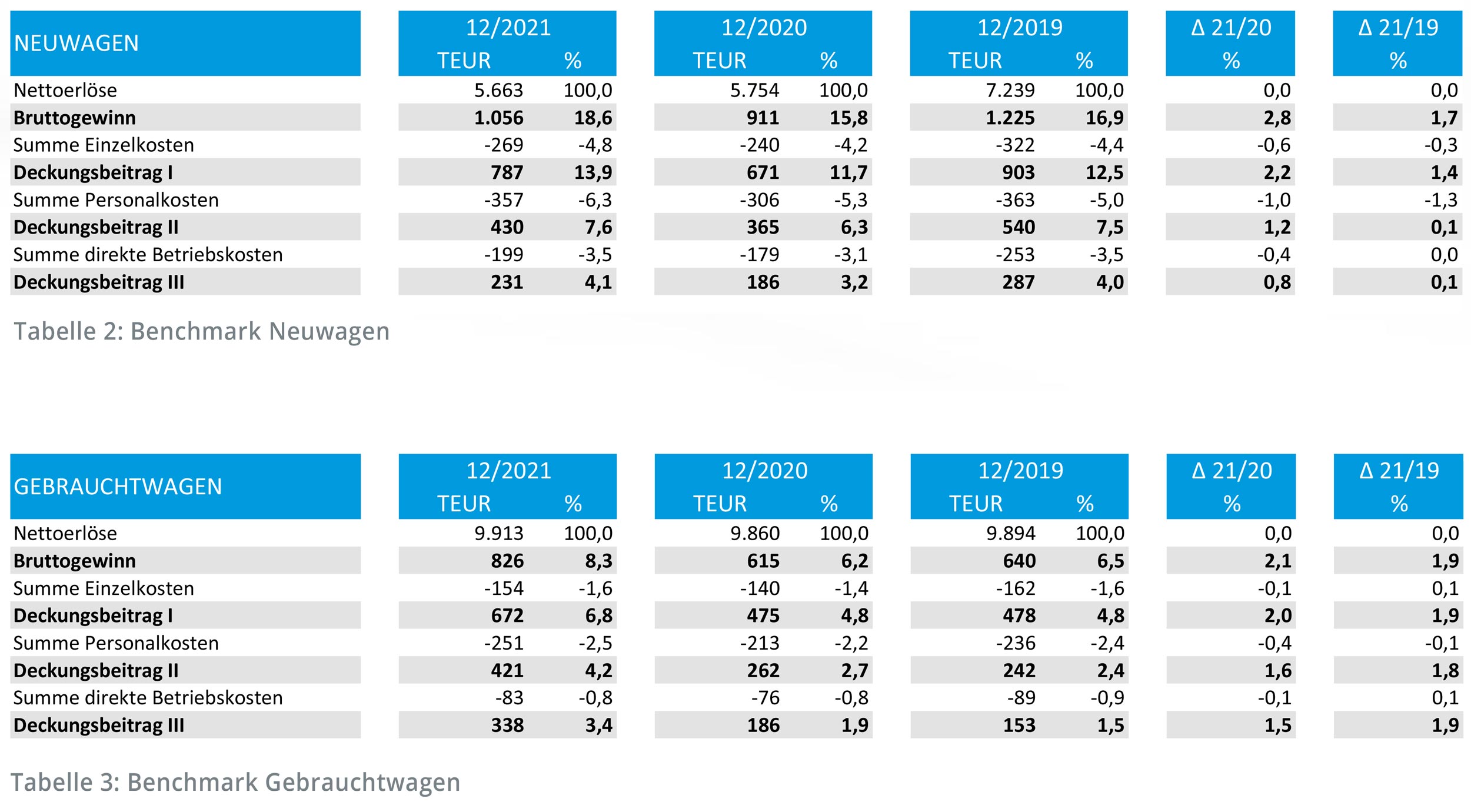Vor allem der Gebrauchtwagen-Bereich profitiert von der Verknappung der Neuwagen. Während die Nettoerlöse relativ konstant bleiben, kommt es beim Bruttogewinn zu einem deutlichen relativen und absoluten Anstieg (vgl. Tabelle 3). Die sinkenden Bestände im Gebrauchtwagenbereich und fehlende Neuwagen-Alternativen resultierten in höheren Verkaufspreisen. Da die Kosten relativ konstant gehalten werden konnten, liegt der relative Deckungsbeitrag III um 1,5 bzw. 1,9 Prozent über den Vorjahren und der absolute Deckungsbeitrag III hat sich im Vergleich zu den Vorjahren fast verdoppelt.